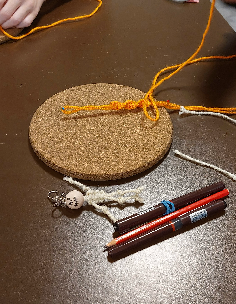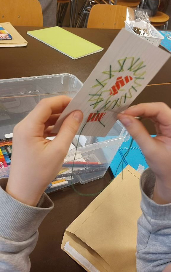 Für die zweite Karte arbeiteten die Kinder mit zwei gekreuzten Fäden, was etwas mehr Aufmerksamkeit und Regelmäßigkeit erforderte.Es war eine gute Übung für die Konzentration, und viele stellten überrascht fest, wie stark ein Motiv sich verändern kann, wenn nur die Farben anders gewählt werden. Diese Entdeckungen führten zu kleinen Gesprächen, Vergleichen und spontanen Entscheidungen an jedem Tisch.